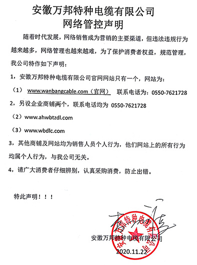 鄭重聲明:安徽萬邦特種電纜有限公司官方網站為:www_wanbangcable_com.abdjx.com,除此之外無任何子網站或合作網站,其余均為假冒偽劣。電話:0550-7621728 13485756353 地 址:安徽省天長市滁州高新技術產業開發區經四路29號
